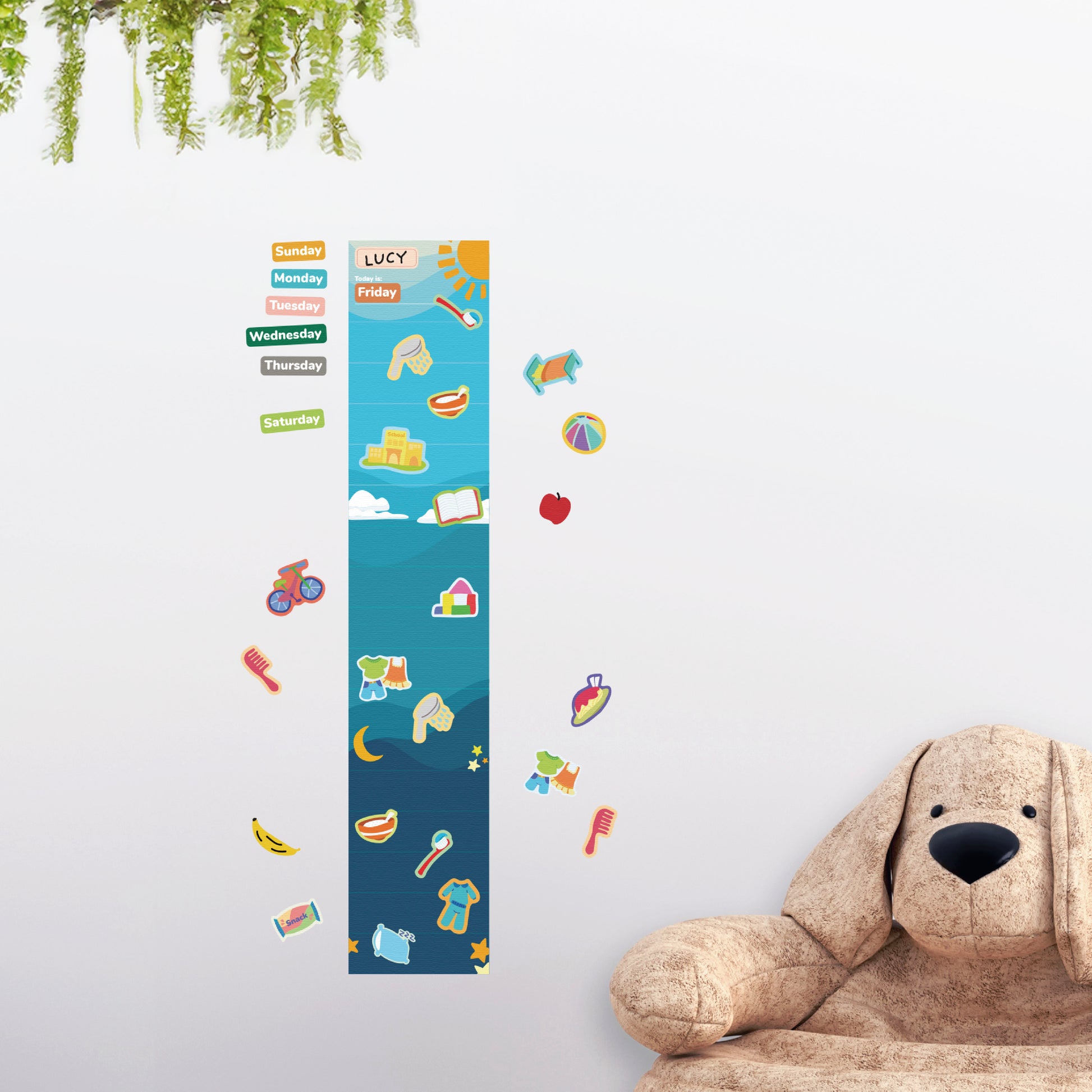 Pack consists a total of 36 decals: Monday to Sunday in various colours, a book, a ball, a bicycle, a school, a bed, a snack, a pillow, a banana, an apple, a set of pyjamas, a set of toy blocks, 2 sets of everyday clothes, 2 bowls of rice, 2 plates of pasta, 2 combs, 2 sets of toothbrushes, 2 showerheads.