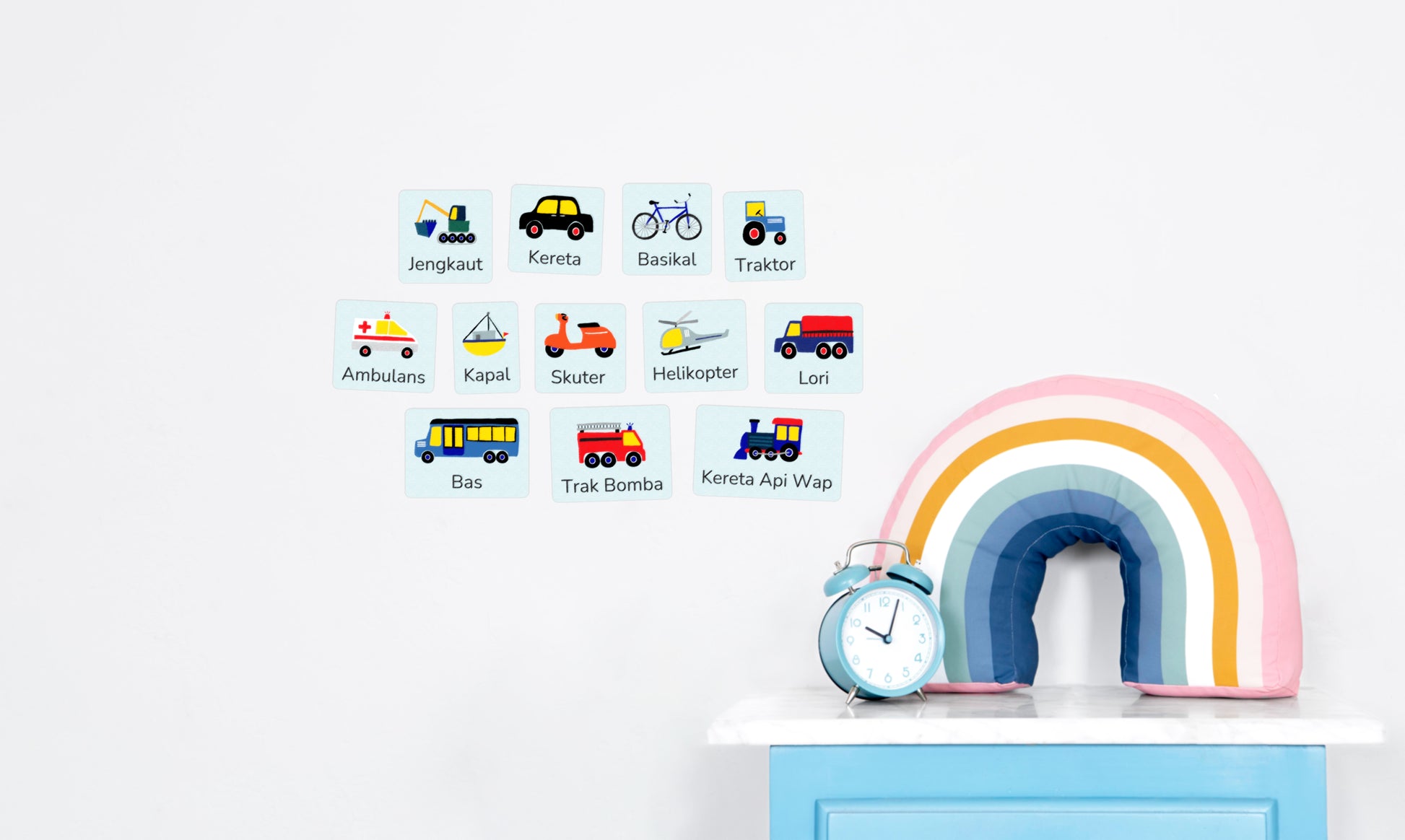 - 15 decals in Malay - a bicycle, scooter, car, truck, bus, ambulance, firetruck, tractor, excavator, a steam train with 2 carriages, airplane, helicopter, and ship.
