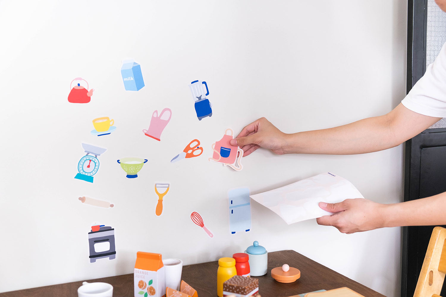 - 14 decals - a refrigerator, colander, kettle, apron, oven mitts, pair of scissors, blender, peeler, whisk, rolling pin, weighing scale, carton of milk, oven, teacup and saucer.
