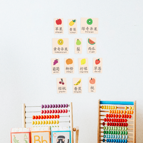 - Pack Consists of 12 fruits in Chinese and Hanyu Pinyin - Watermelon, Orange, Lemon, Cherries, Grapes, Peach, Pineapple, Banana, Kiwi (Green and Yellow) Strawberry, Pear and Apple.